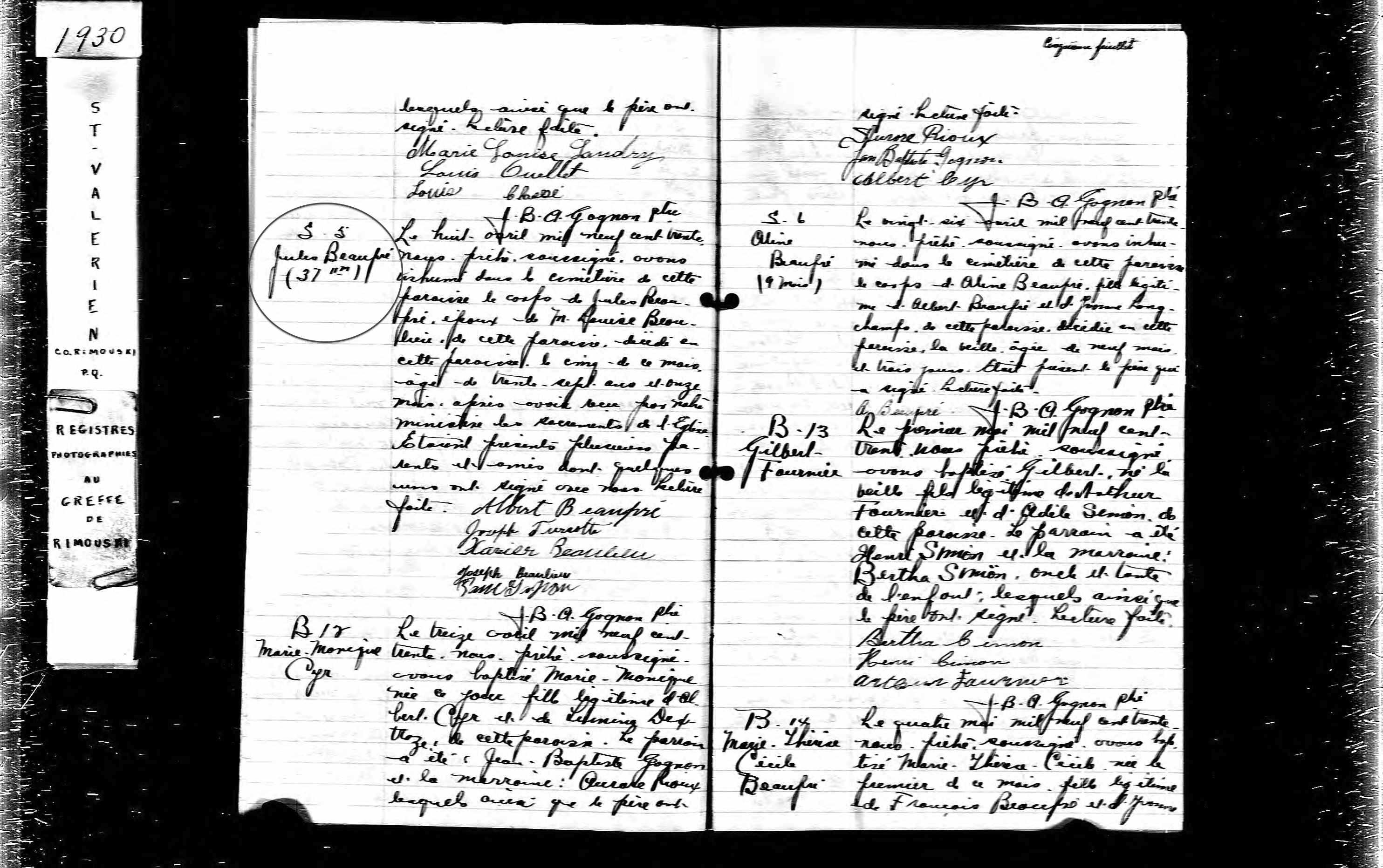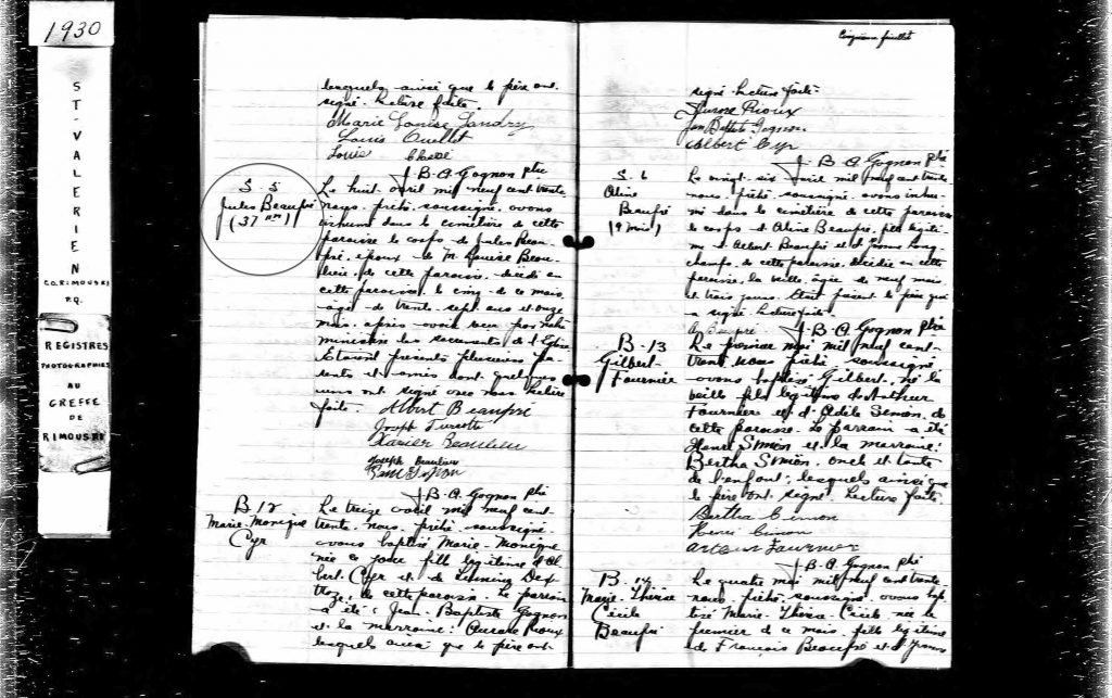 En 1930, décès de Jules Beaupré à Saint-Valérien, Québec.